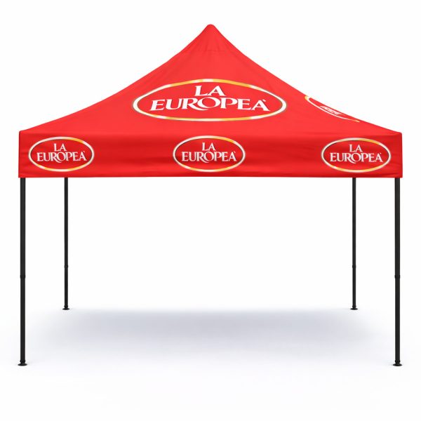Carpa plegable LA EUROPEA. Ideal para eventos y actividades de marca. 3 m de alto x 3 m de ancho. Material estructura metálica con tela acrílica. Elementos en vinil térmico.